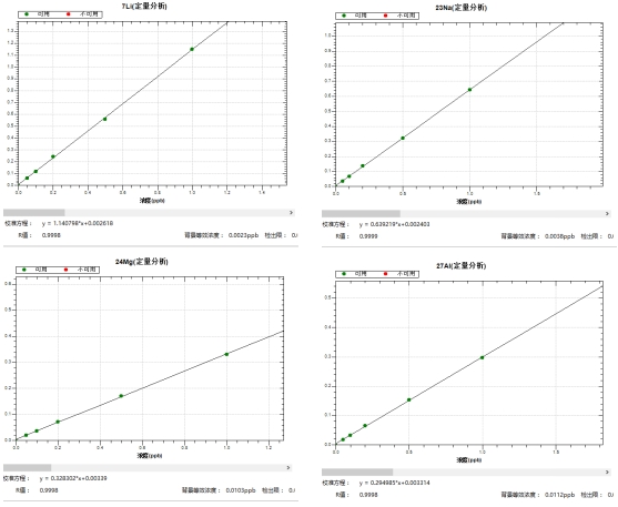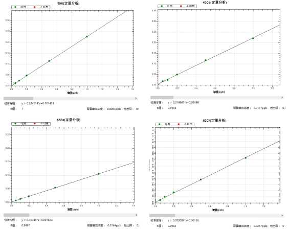 冷焰形式下,绘制各元素0,0.05,0.1,0.2,0.5,1.0μg/L系列浓度标液任务曲线,39K、40Ca、56Fe同等位素的线性相干系数r均大于0.999,背景等效浓度为0.0023μg/L~0.0217μg/L。