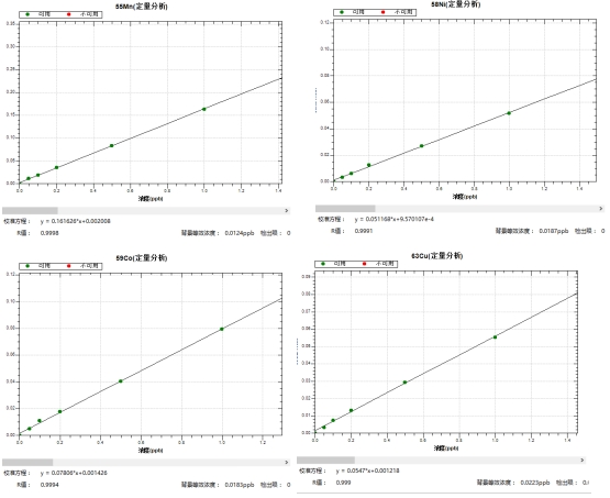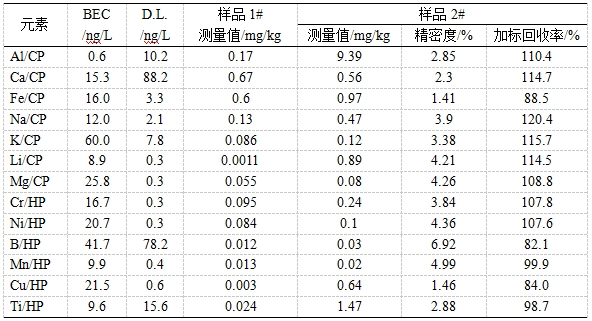 参考《GB/T 32650-2016 电感耦合等离子体质谱法检测石英砂中痕量元素》停止样品前处置。操纵冷焰形式及规范形式对样品停止测试,考查背景等效浓度(BEC)、体例检出限(D.L.)、加标收受接管率、精密度。背景等效浓度在0.6ng/L~60.0ng/L之间,体例检出限在0.3ng/L~88.2ng/L之间,加标收受接管率在82.1%~120.4%之间,精密度在1.41%~6.92%之间。